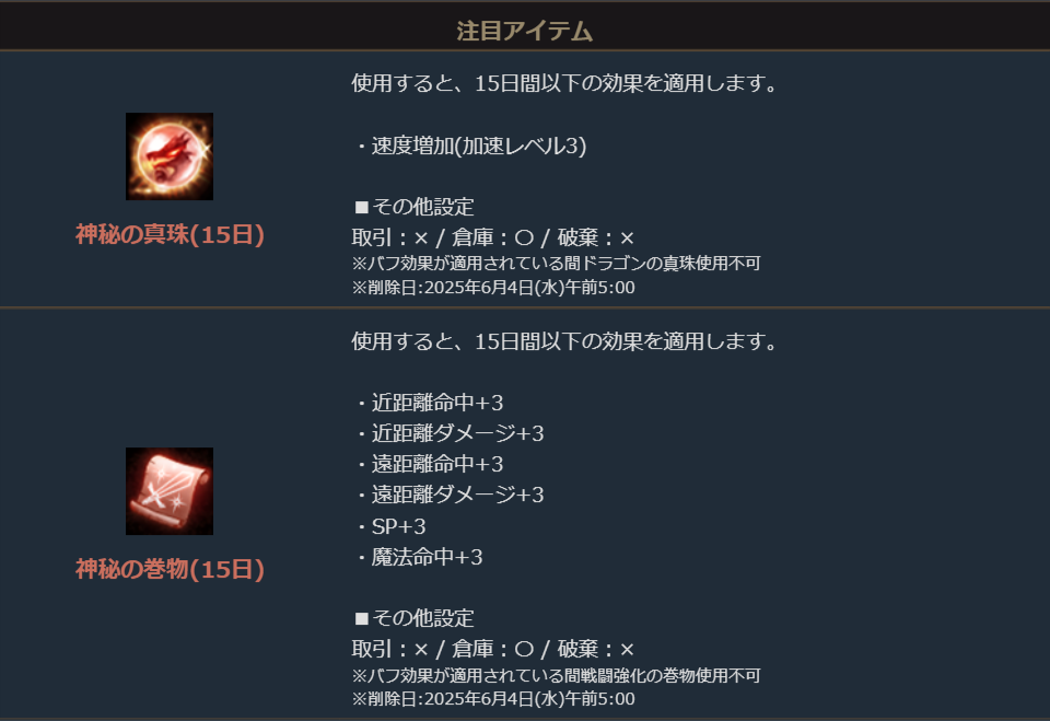 ※一部アイテムが期間終了後も未使用の場合、一定期間が経過すると自動で削除されます。詳しくは各アイテムの詳細をご確認ください。