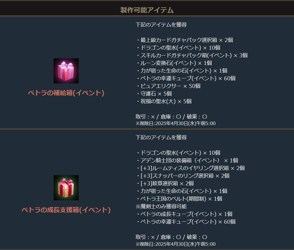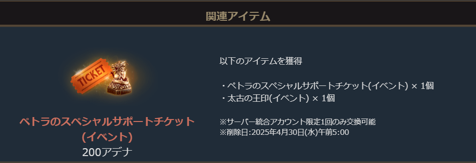 キャンペーン期間中にゲーム内ショップより「ペトラのスペシャルサポートチケット(イベント)」をアデナで交換する事で製作出来るスペシャルなアイテムをご用意させていただきました。