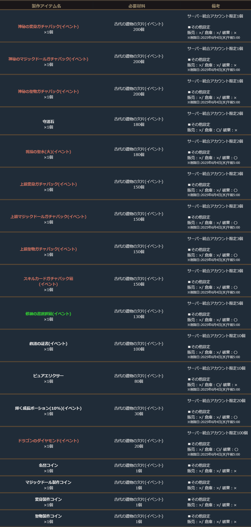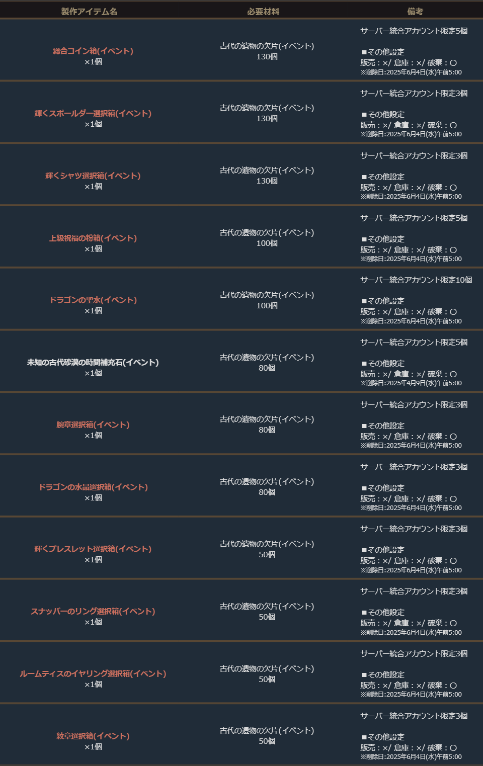 「古代の遺物の欠片(イベント)」を集めてイベント専用の製作を行い、アイテムを獲得しましょう!