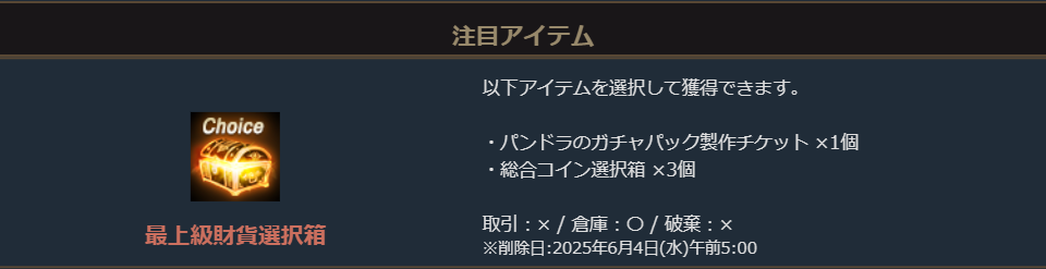 「総合上級ガチャパック選択箱」2個に加えて「最上級財貨選択箱」4個が獲得できるパッケージです。