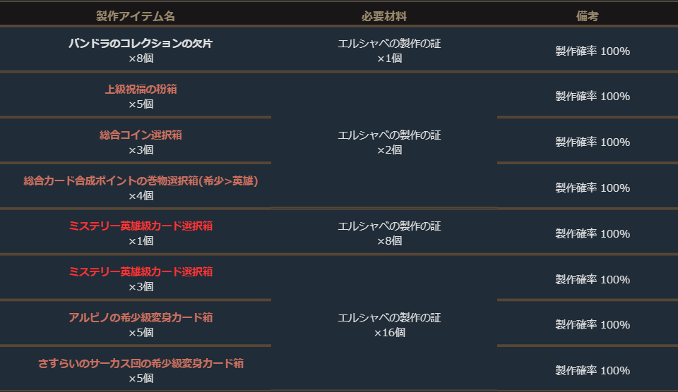 さらに、付属の「エルシャベの製作の証」を素材に「ミステリー英雄級カード選択箱」や「さすらいのサーカス団の希少級変身カード箱」等の製作が可能です。