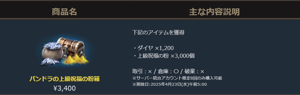 2025年4月2日より販売を開始しました「パンドラの上級祝福の粉箱」のご案内を申し上げます。