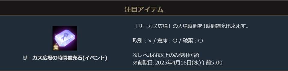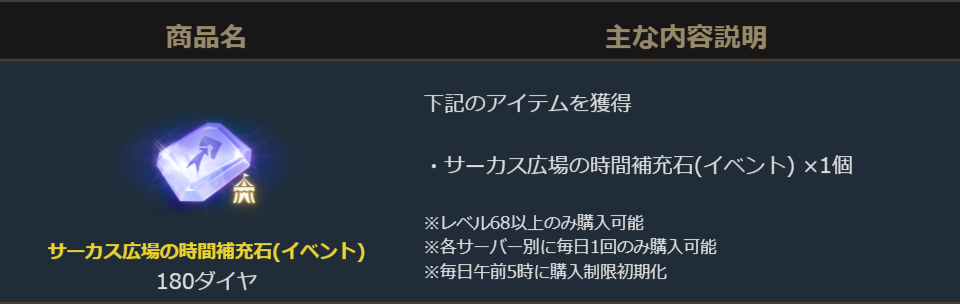 期間中、イベント開催を記念して「サーカス広場の時間補充石(イベント)」を販売致します。
