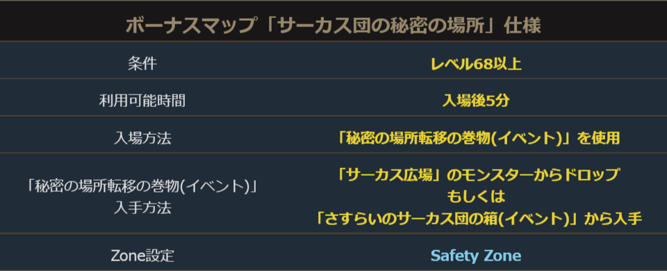 更に、上記のドロップアイテムに加えて、ボーナスマップ「サーカス団の秘密の場所」に入場できるアイテムもドロップします!