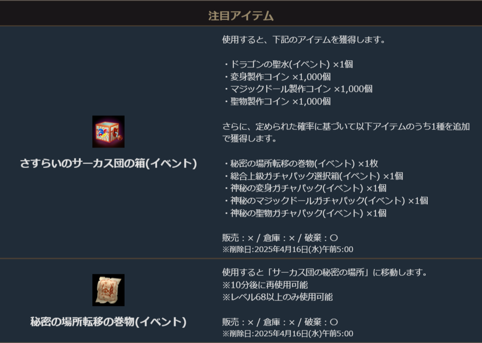 ※一部アイテムが期間終了後も未使用の場合、一定期間が経過すると自動で削除されます。詳しくは各アイテムの詳細をご確認ください。