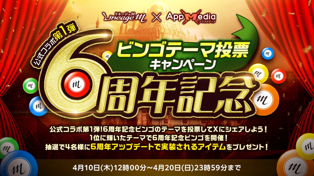 2025年4月10日(木)より攻略wiki「AppMedia」とのコラボレーションイベントとして「公式コラボ第1弾 6周年記念ビンゴテーマ投票キャンペーン」を開催いたします。