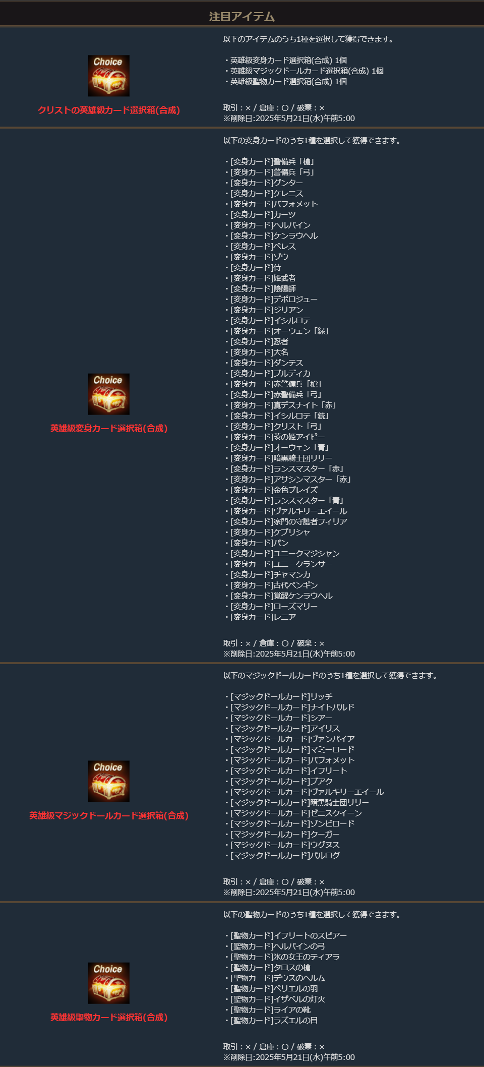 ※一部アイテムは未使用の場合、一定期間が経過すると自動で削除されます。詳しくは各アイテムの詳細をご確認ください。
