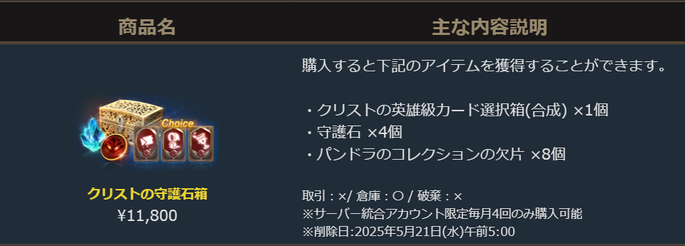「クリストの英雄級カード選択箱(合成)」1個と「守護石」4個と過去に登場したイベントコレクションの一部に代替登録できる「パンドラのコレクションの欠片」8個が獲得できます。