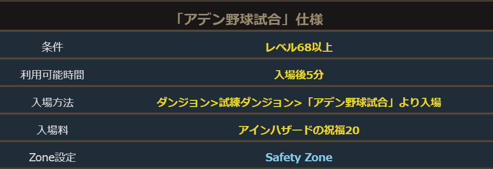 「アデン野球試合」はレベル68以上のキャラクターが入場できるダンジョンになっています。