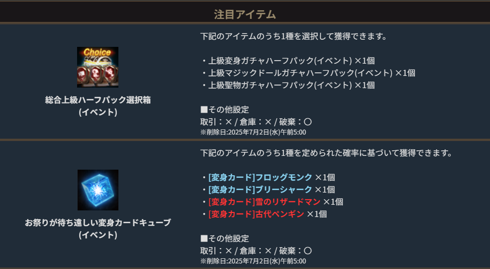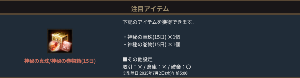 ※一部アイテムが期間終了後も未使用の場合、一定期間が経過すると自動で削除されます。詳しくは各アイテムの詳細をご確認ください。