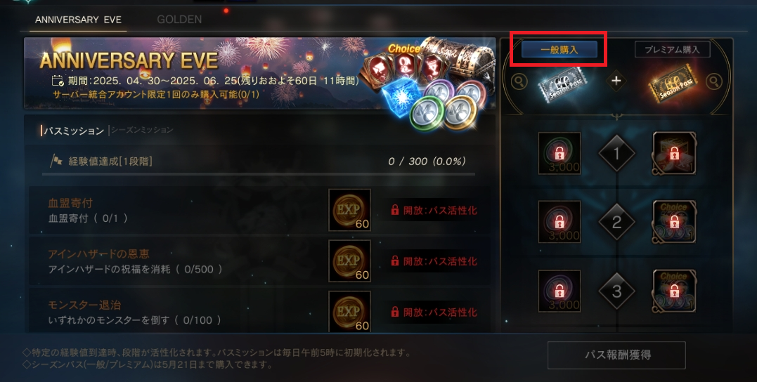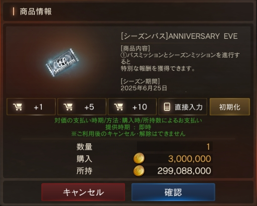 「[シーズンパス]ANNIVERSARY EVE」は3,000,000アデナ、「[プレミアムシーズンパス]ANNIVERSARY EVE」は3,000ダイヤでそれぞれ購入できます。