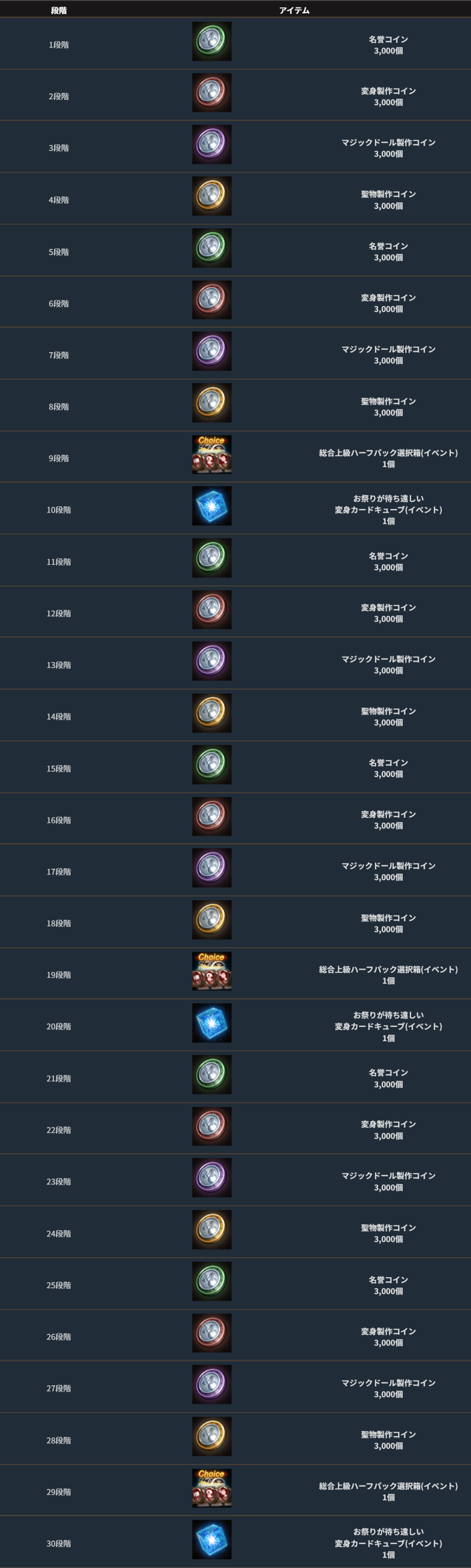 経験値達成段階毎に、下記の報酬を獲得できます。