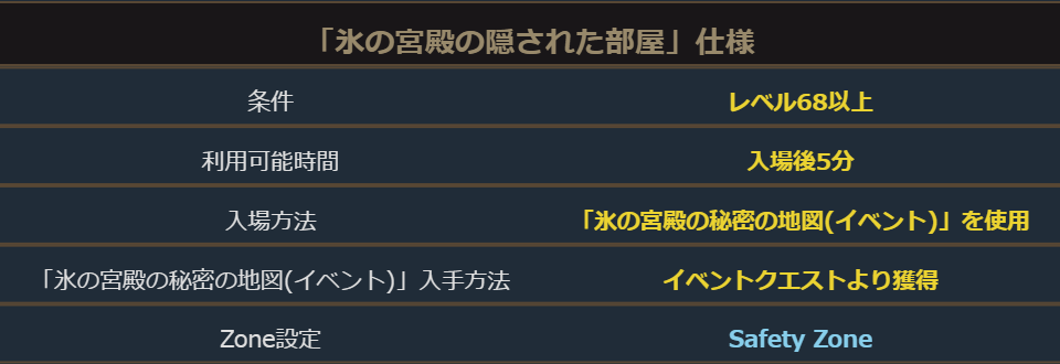 「氷の宮殿の隠された部屋」はレベル68以上のキャラクターが入場できるダンジョンになっています。