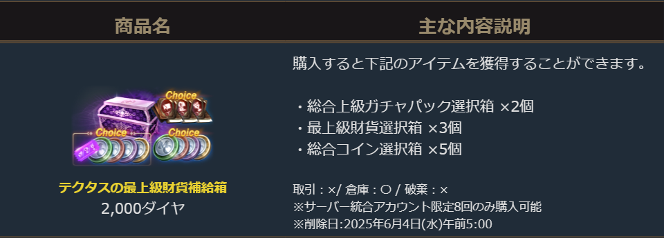 2025年5月14日より販売を開始しました「テクタスの最上級財貨補給箱」のご案内を申し上げます。