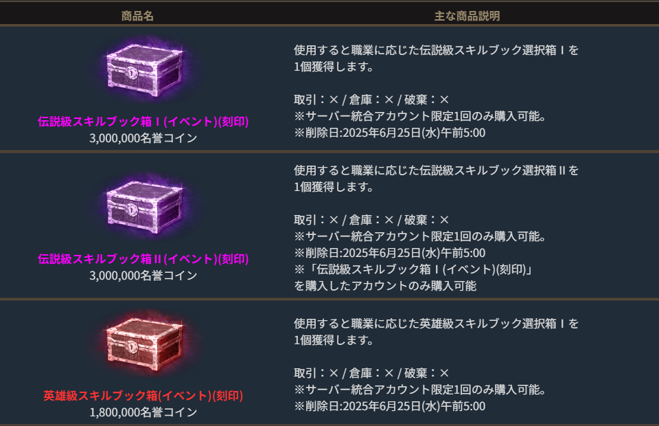 「伝説級スキルブック箱Ⅰ(イベント)(刻印)」と「英雄級スキルブック箱(イベント)(刻印)」の交換が可能です。
