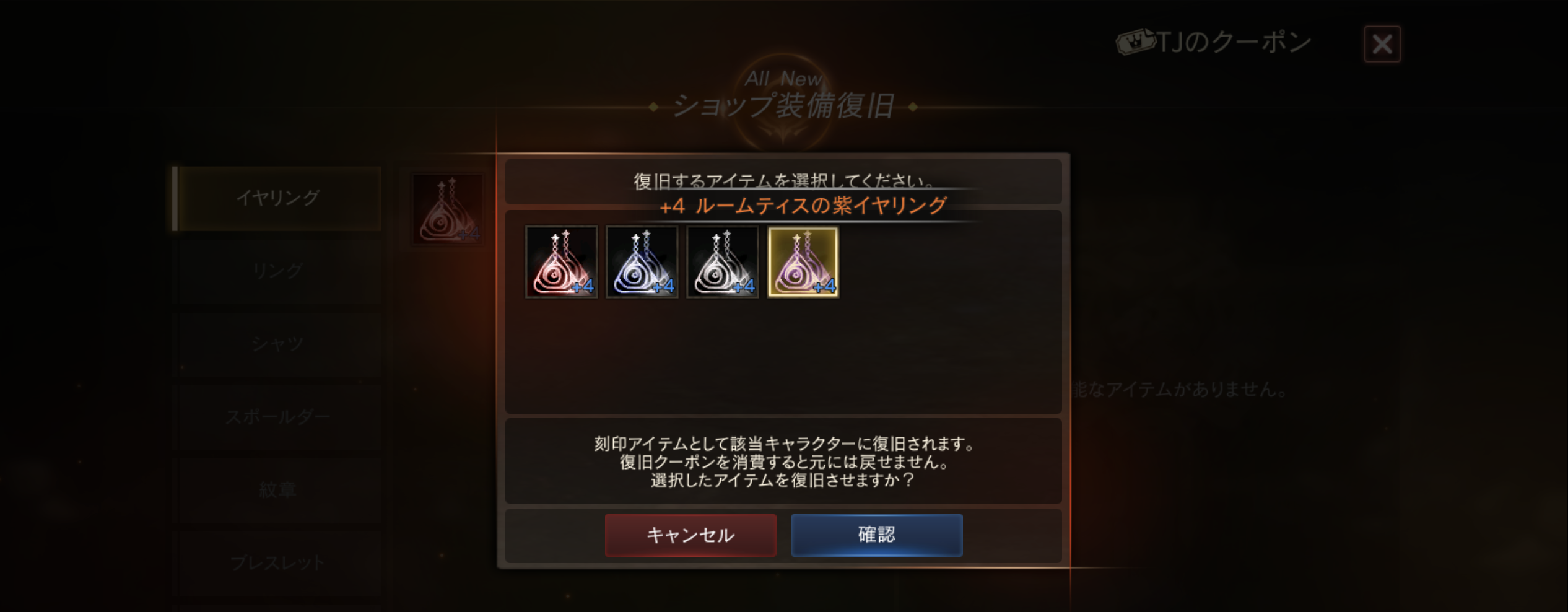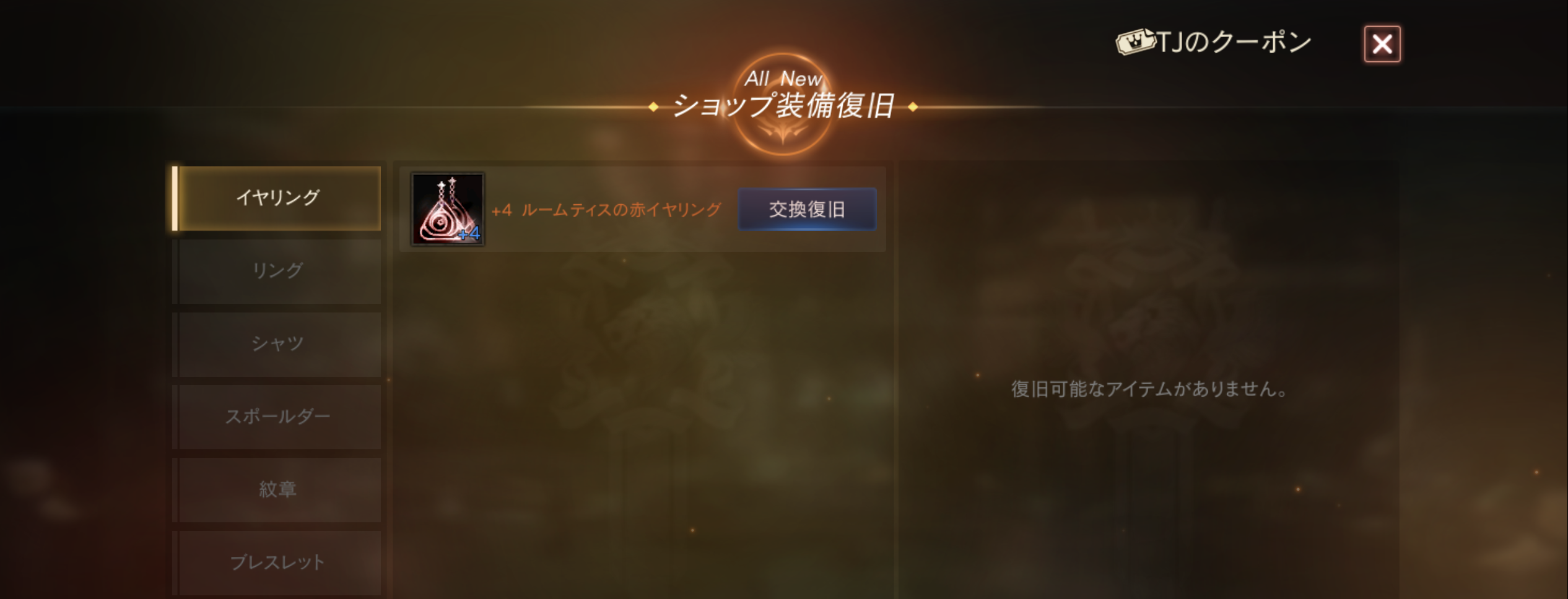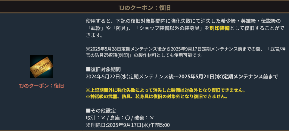TJのクーポン:復旧は、対象期間内にアカウント内のキャラクターごとに希少級・英雄級・伝説級で強化失敗した武器や防具、ショップ装備以外の装身具を復旧することができる特別なアイテムです。