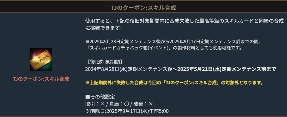 ※「TJのクーポン:復旧」と「TJのクーポン:スキル合成」は2025年5月28日(水)定期メンテナンス後から使用可能になります。