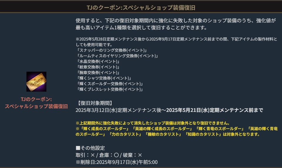 TJのクーポン:スペシャルショップ装備復旧は、対象期間内にアカウント内のキャラクターごとに強化失敗したショップ装備を復旧することができる特別なアイテムです。