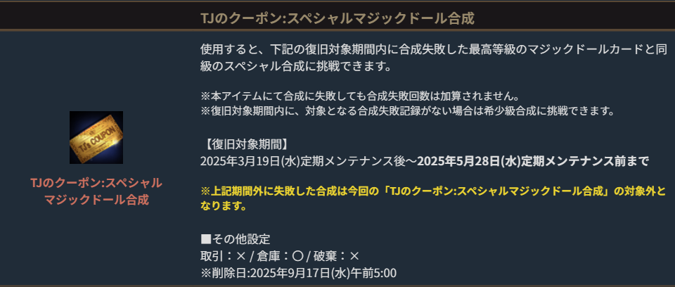 TJのクーポン:スペシャルマジックドール合成は、対象期間内にアカウント単位で合成失敗した最高等級のマジックドールカードの合成に、成功時と失敗時の候補を選択して再挑戦できる特別なアイテムです。