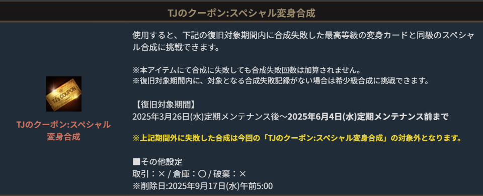 TJのクーポン:スペシャル変身合成は、対象期間内にアカウント単位で合成失敗した最高等級の変身カードの合成に、成功時と失敗時の候補を選択して再挑戦できる特別なアイテムです。
