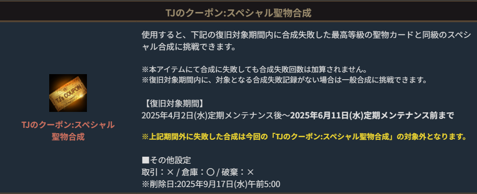 TJのクーポン:スペシャル聖物合成は、対象期間内にアカウント単位で合成失敗した最高等級の聖物カードの合成に、成功時と失敗時の候補を選択して再挑戦できる特別なアイテムです。