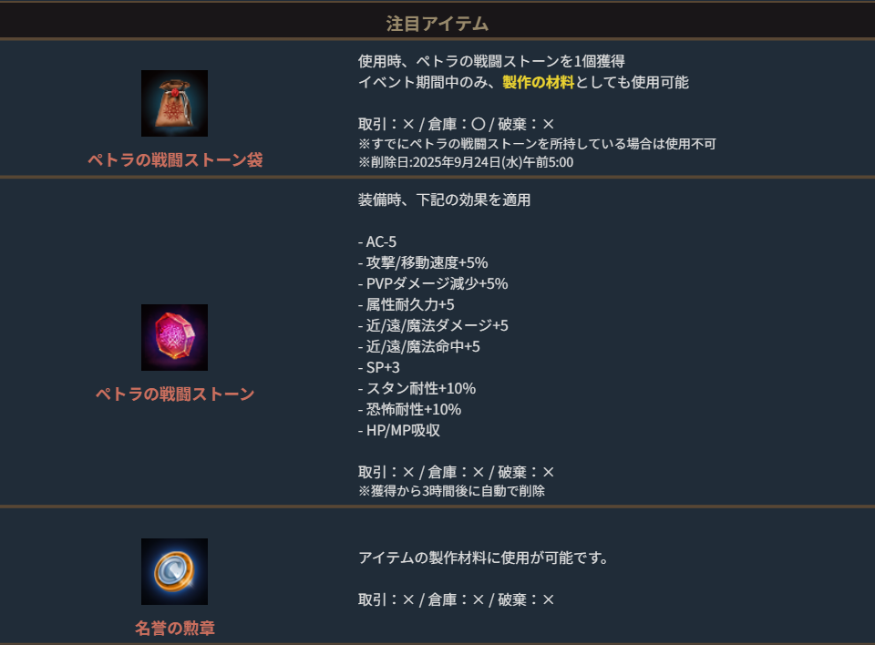 特別な製作の材料として使用可能で、そのまま使用した場合でも様々なバフ効果が得られるアイテムを獲得可能な「ペトラの戦闘ストーン袋」を含むパッケージが登場しました。