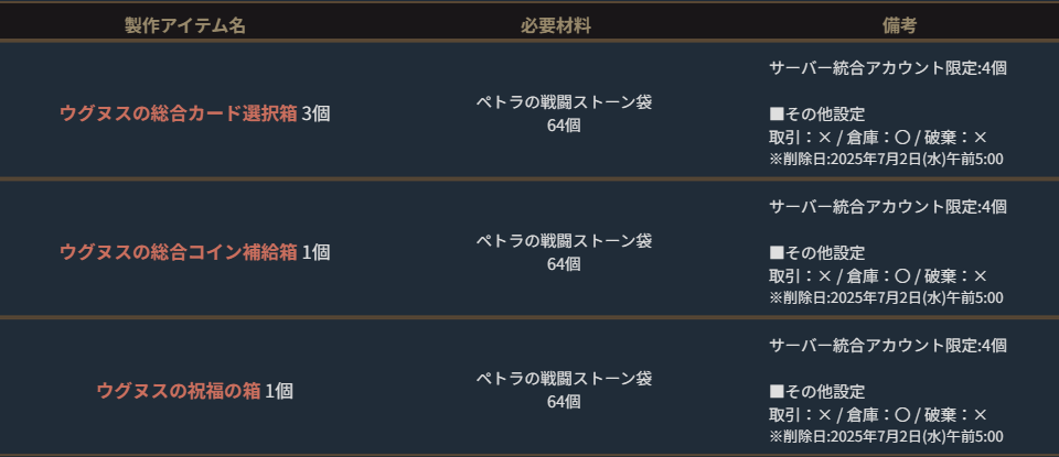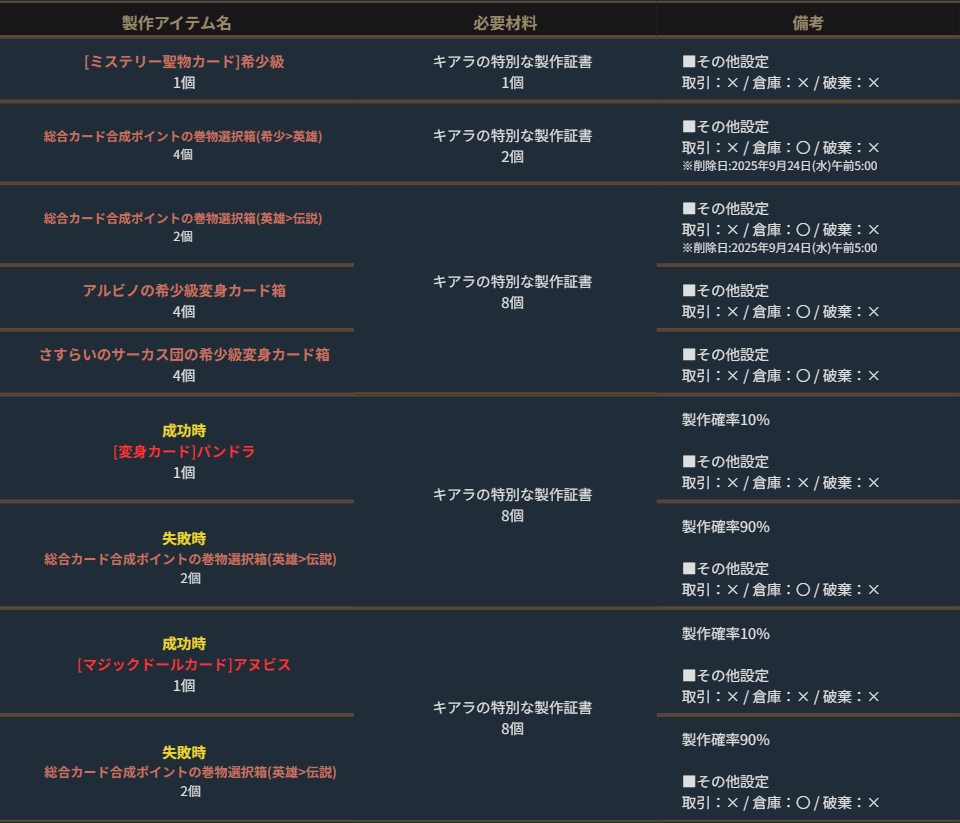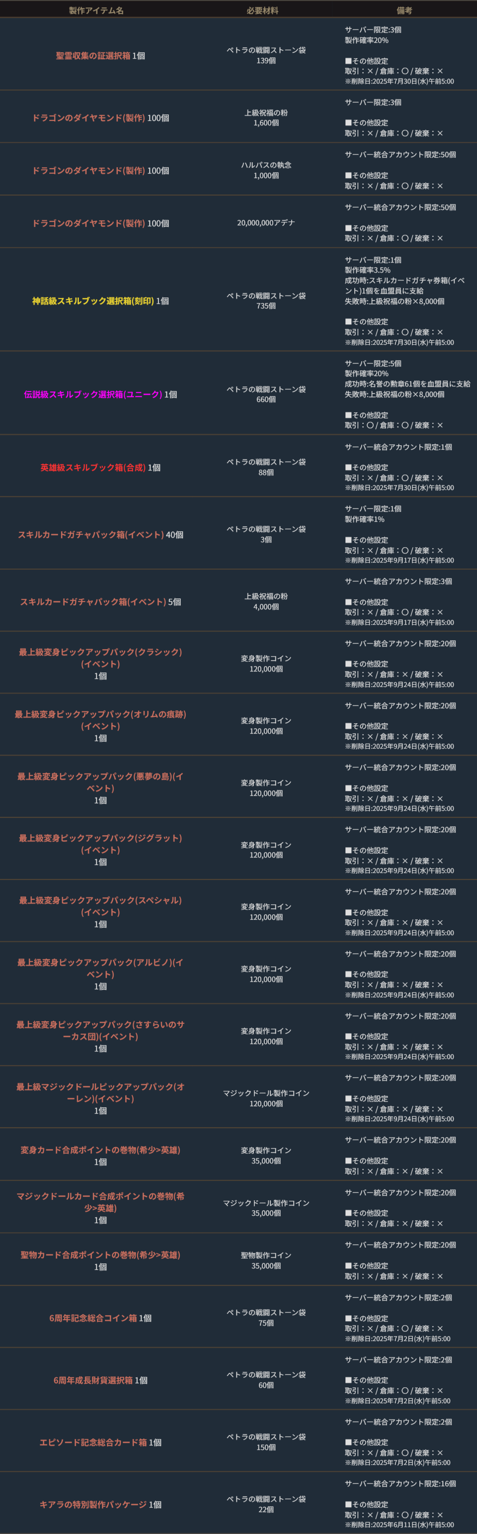 ※期間限定の製作アイテムは、製作可能期間のみゲーム内の「製作」より製作することができます。