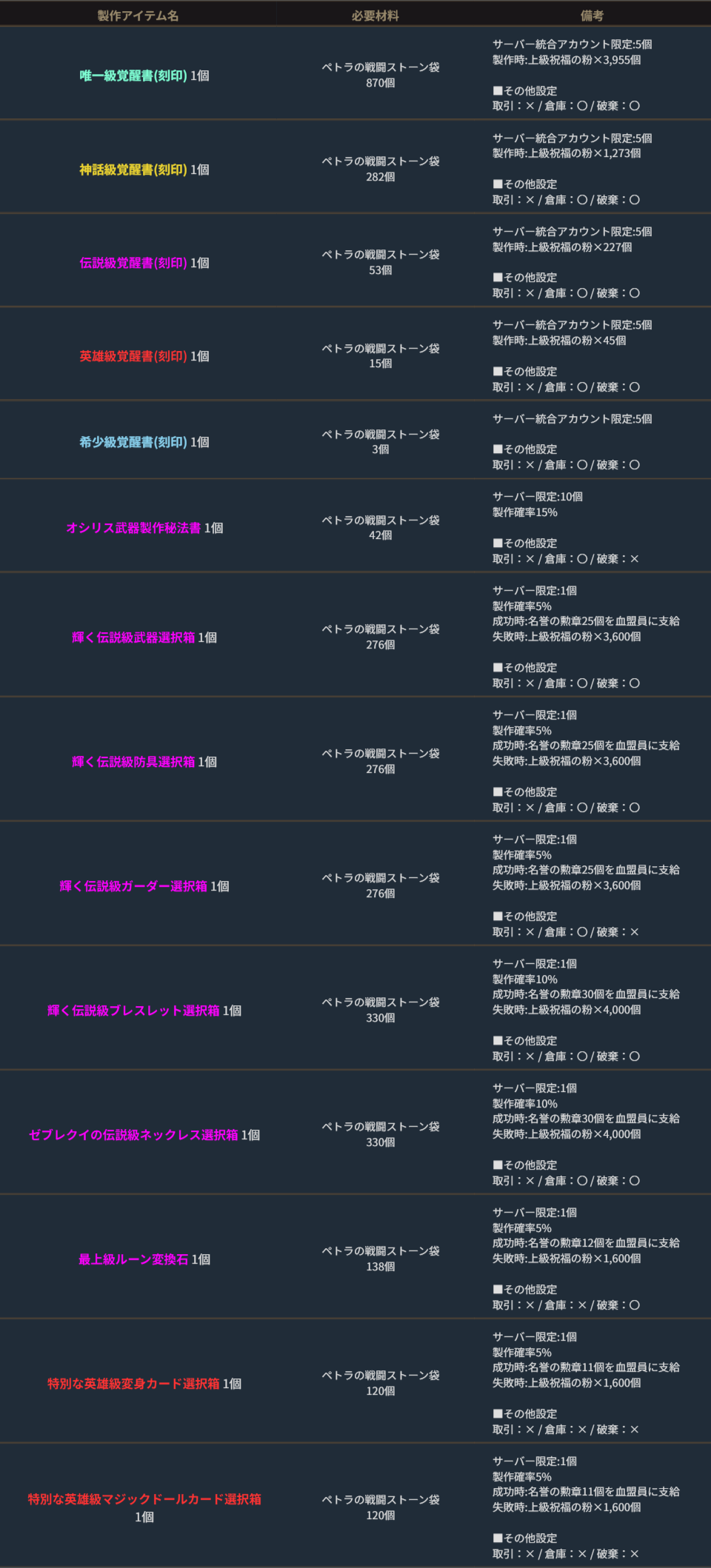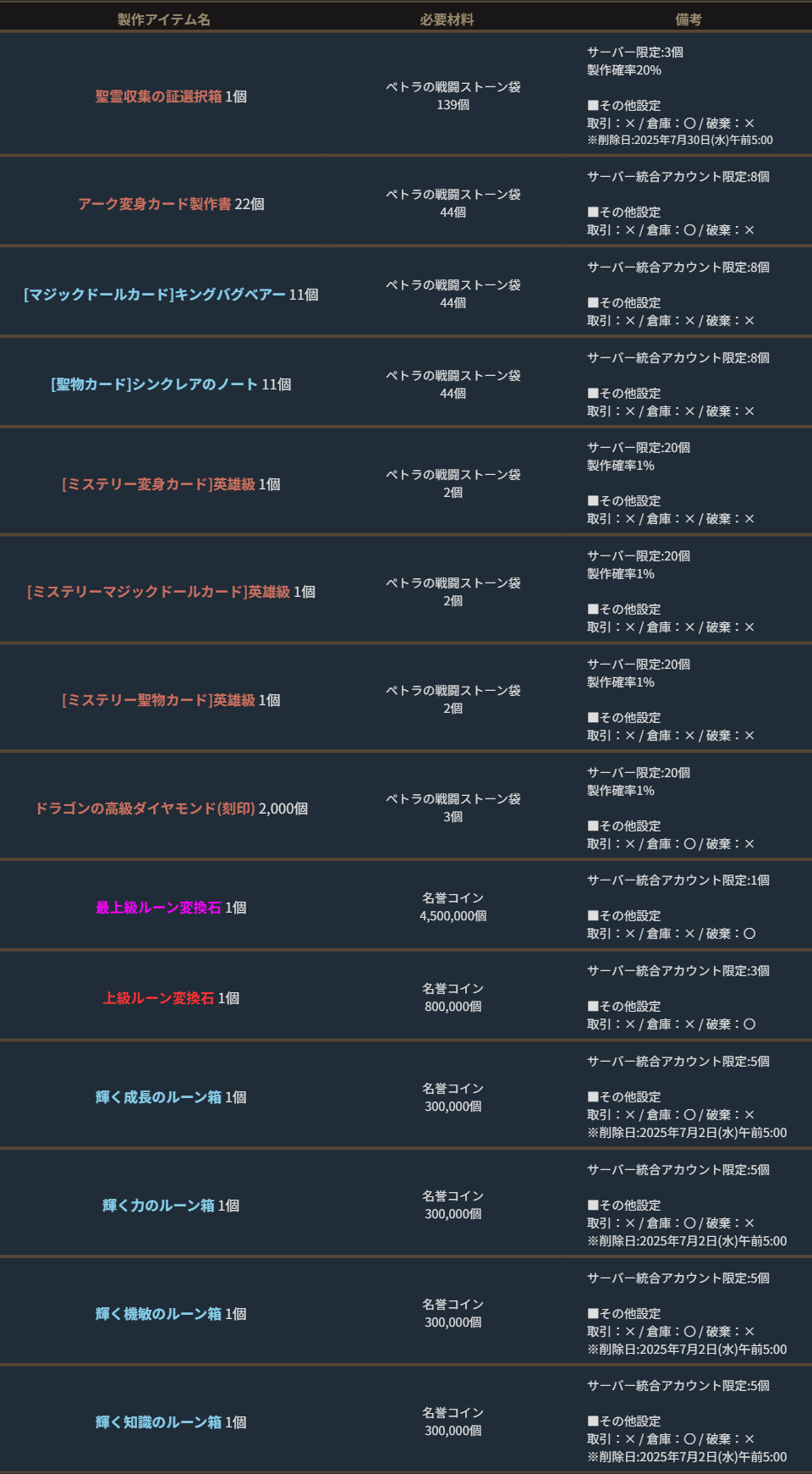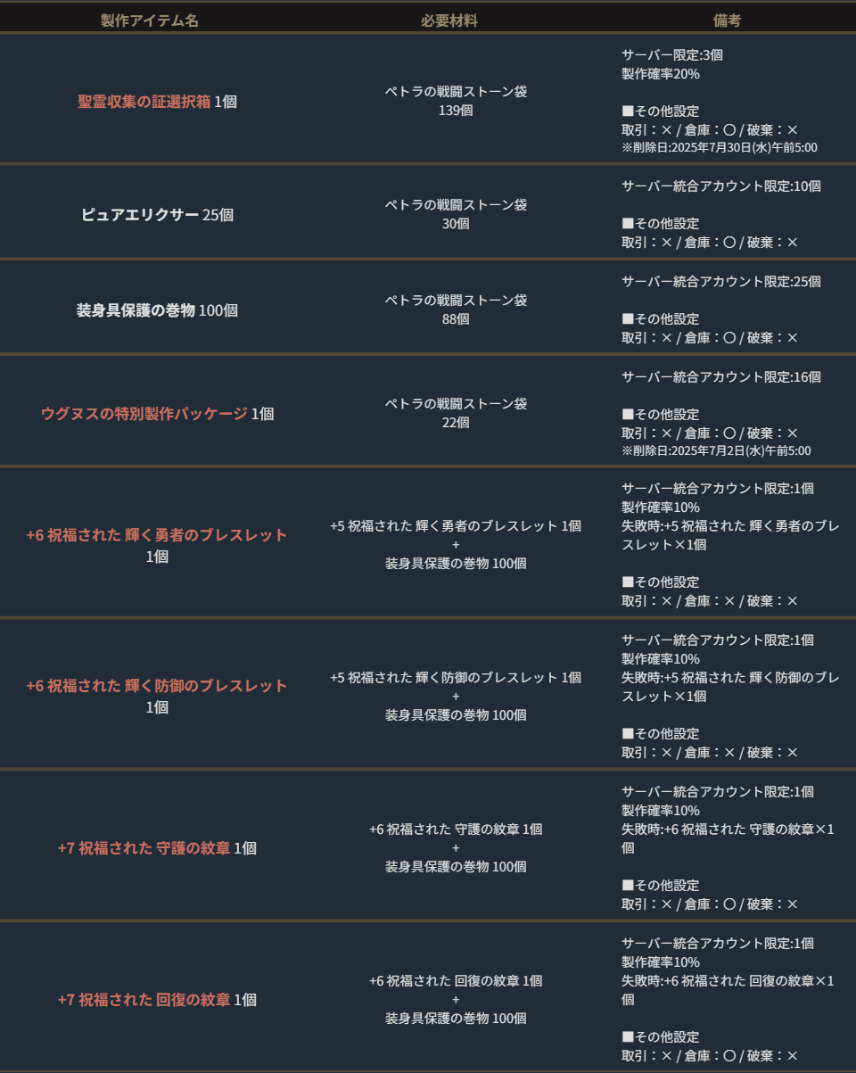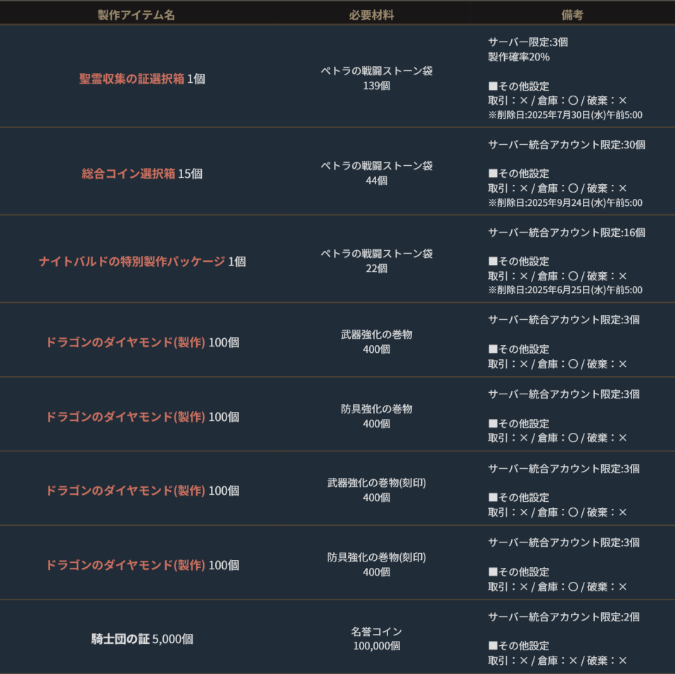 ※サーバー数量限定の製作アイテムは、各サーバーで製作できる数量に上限があります。