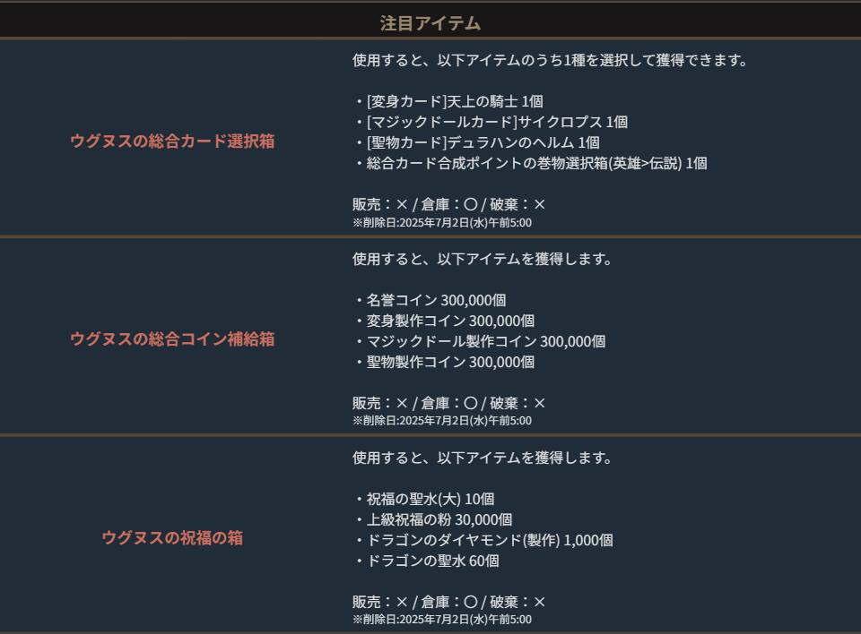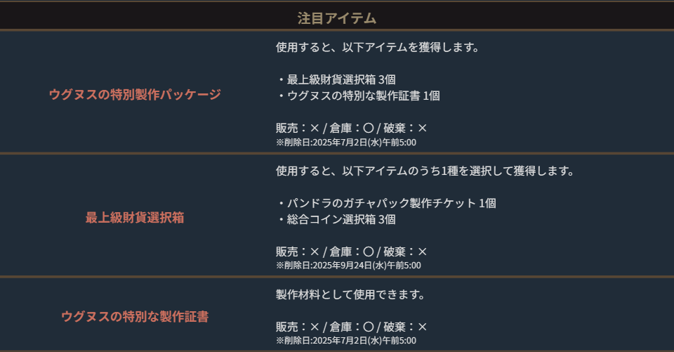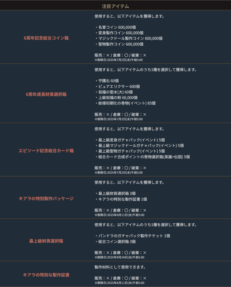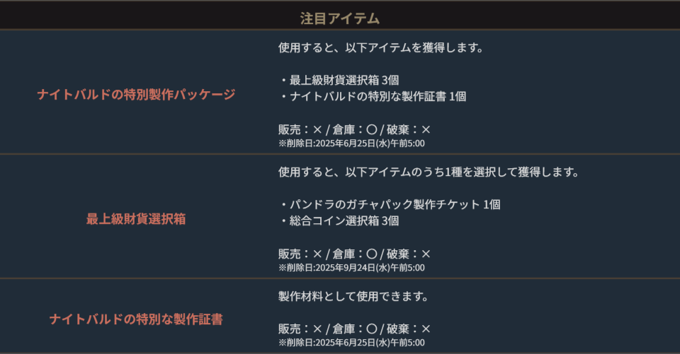 ※一部アイテムは未使用の場合、一定期間が経過すると自動で削除されます。詳しくは各アイテムの詳細をご確認ください。