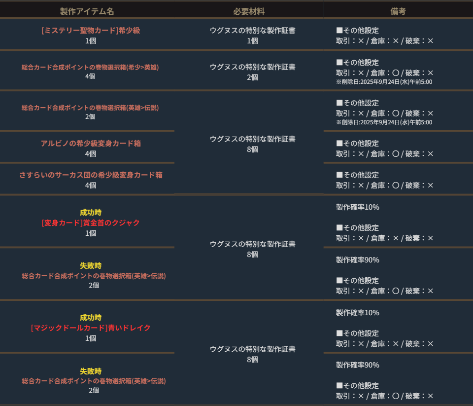 また、一部のアイテム製作成功時には、成功ペイバックとして記載のアイテムを獲得できます。