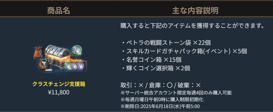 クラスチェンジ時にアイテムやスキルの交換費用となる「ペトラの戦闘ストーン袋」22個と一緒に「スキルカードガチャパック箱(イベント)」5個や「名誉コイン箱」15個、更に「名誉コイン」「変身製作コイン」「マジックドール製作コイン」の中から選択して100,000個獲得できる「輝くコイン選択箱」2個が獲得出来るクラスチェンジを支援するパッケージです。