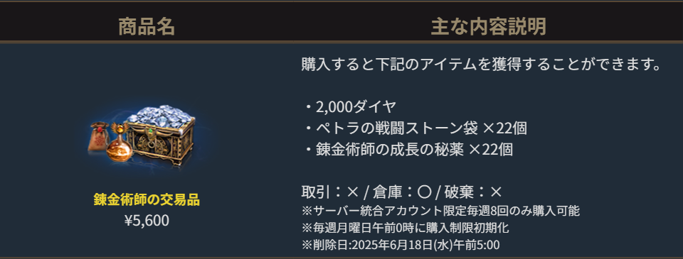 また、2,000ダイヤと「ペトラの戦闘ストーン袋」22個と「錬金術師の秘薬」22個が獲得できる「錬金術師の交易品」も同時販売!