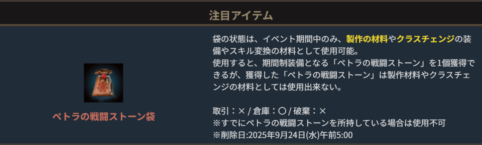 クラスチェンジで装備やスキルを交換する時に必要な「ペトラの戦闘ストーン袋」!