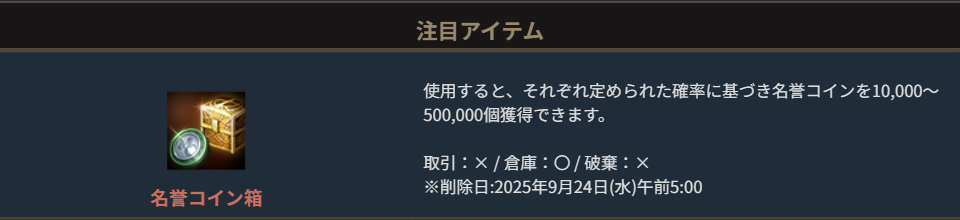 [血盟商人]でスキルブックを獲得する際や、インゲームショップの「名誉コイン」タブで期間特別交換可能な「スキルブック箱」を獲得する際に不足しがちな名誉コインを獲得できる「名誉コイン箱」!