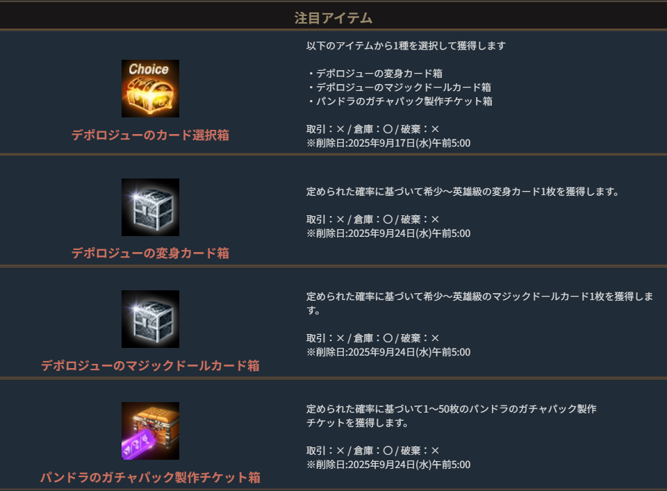 ※一部アイテムは未使用の場合、一定期間が経過すると自動で削除されます。詳しくは各アイテムの詳細をご確認ください。