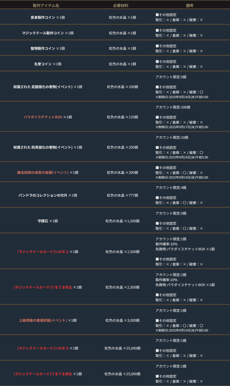 「パラダイスチケットBOX」を通じて確率で獲得できる「虹色の水晶」を集めて、新マジックドール「てるてる坊主」や「シロネコ」の製作に挑戦しましょう!