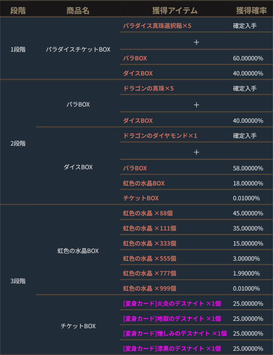 さらに、低確率で手に入る「チケットBOX」からは伝説級変身カードを1種獲得することができます。
