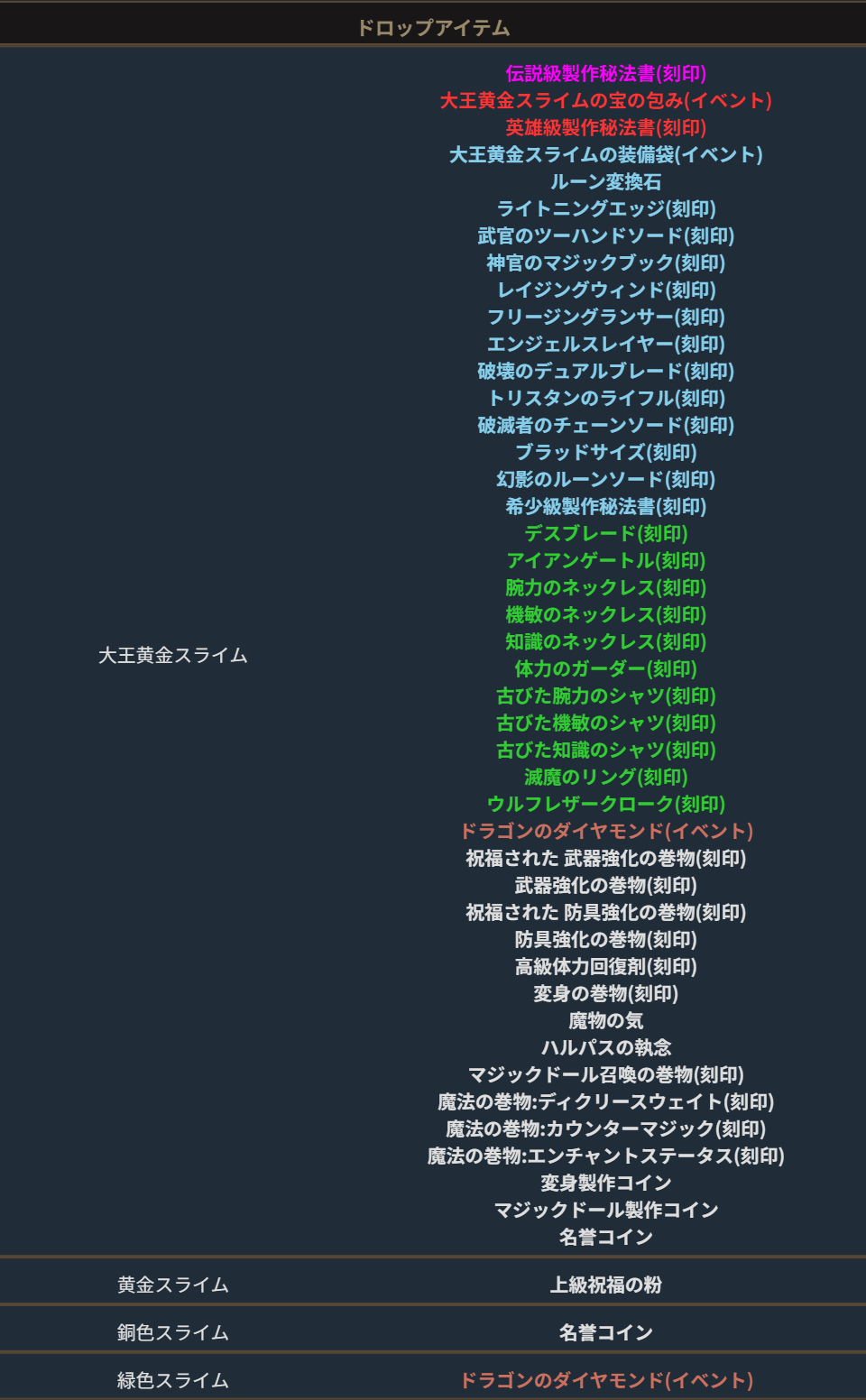 「大王黄金スライム」達を討伐すると、定められた確率に基づき下記のアイテムをドロップします。