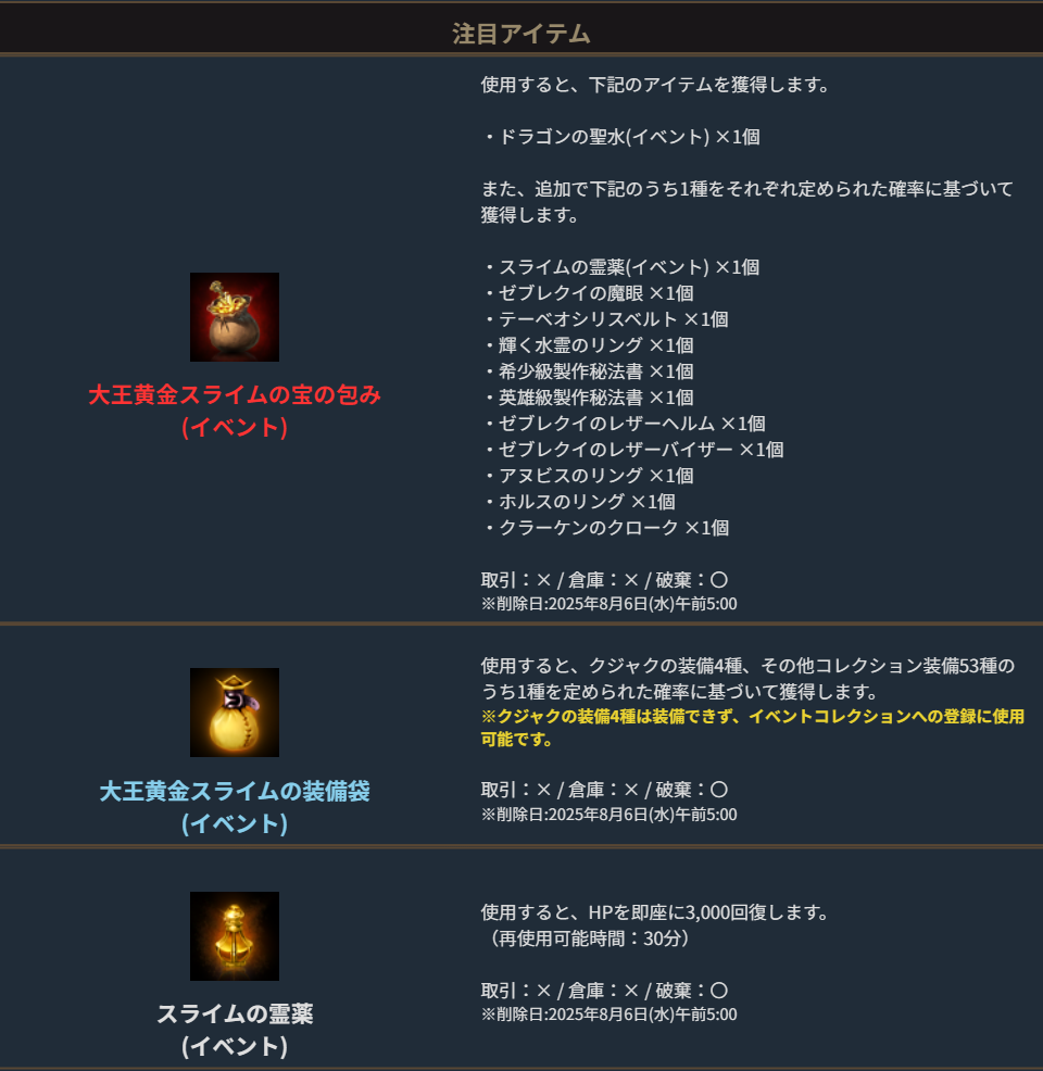 「大王黄金スライム」を時間内に討伐する事で、様々なアイテムが獲得出来る「大王黄金スライムの宝の包み(イベント)」やコレクション装備を獲得出来る「大王黄金スライムの装備袋(イベント)」等をドロップします。