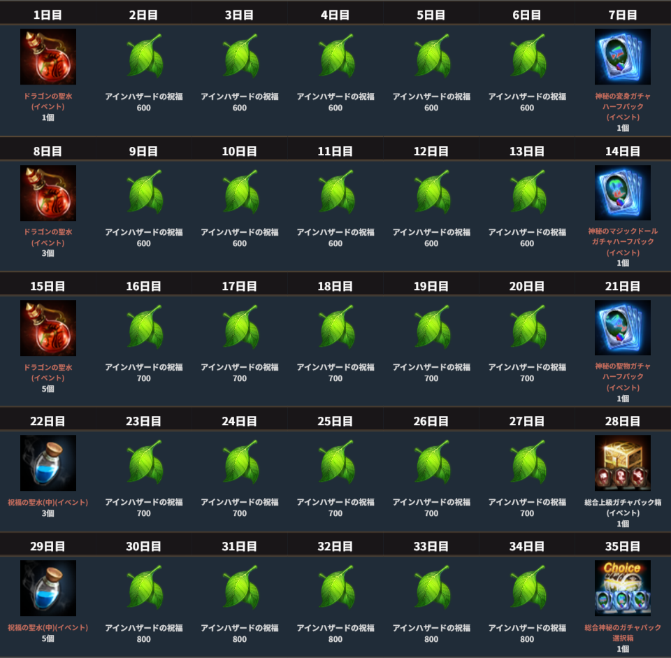 多くのアインハザードの祝福に加え、「ドラゴンの聖水(イベント)」や「総合神秘のガチャパック選択箱」が獲得できます。
