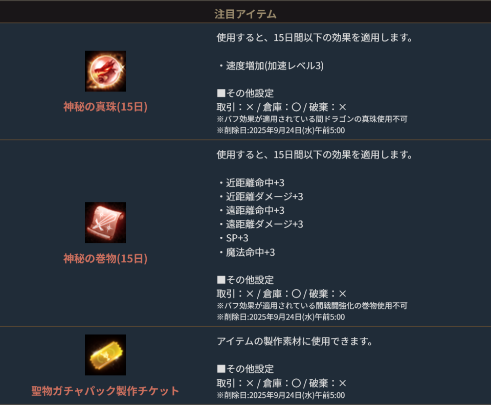 ※一部アイテムが期間終了後も未使用の場合、一定期間が経過すると自動で削除されます。詳しくは各アイテムの詳細をご確認ください。