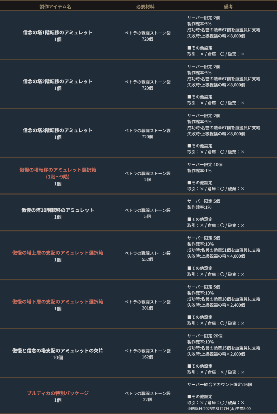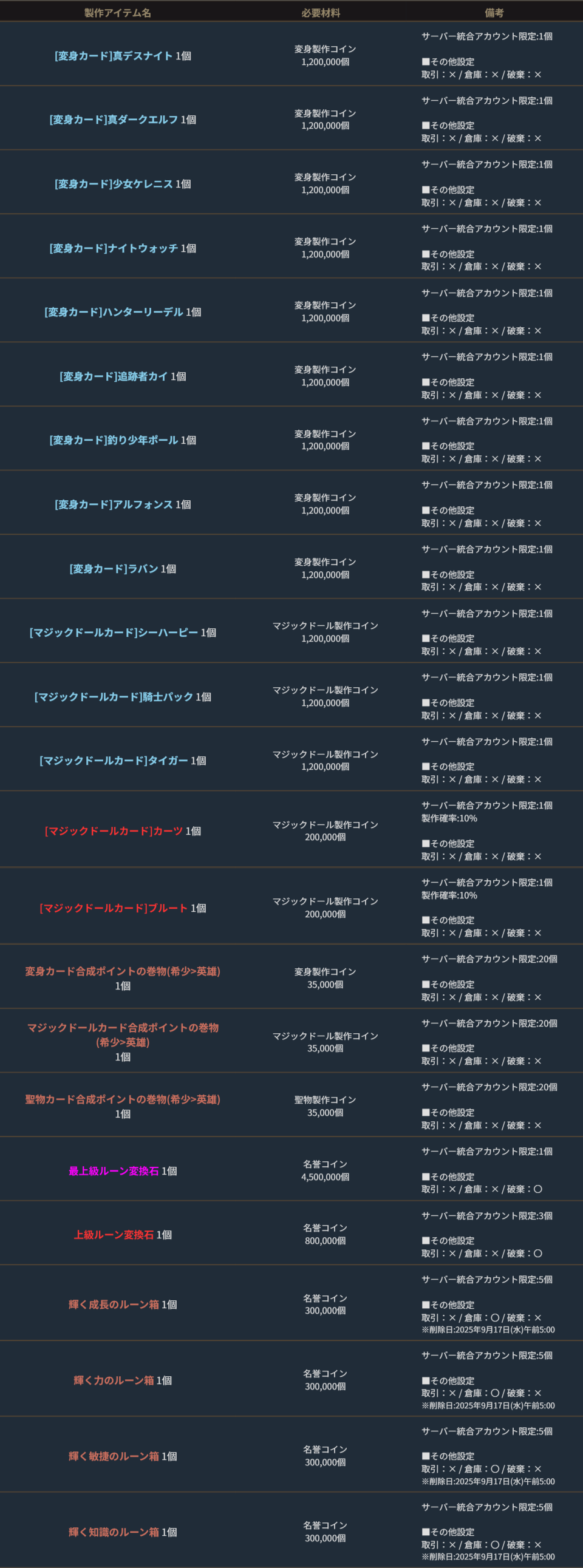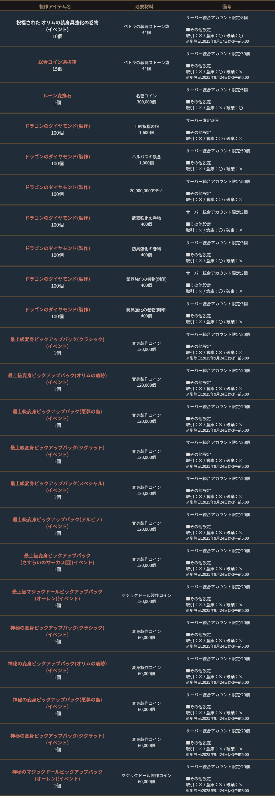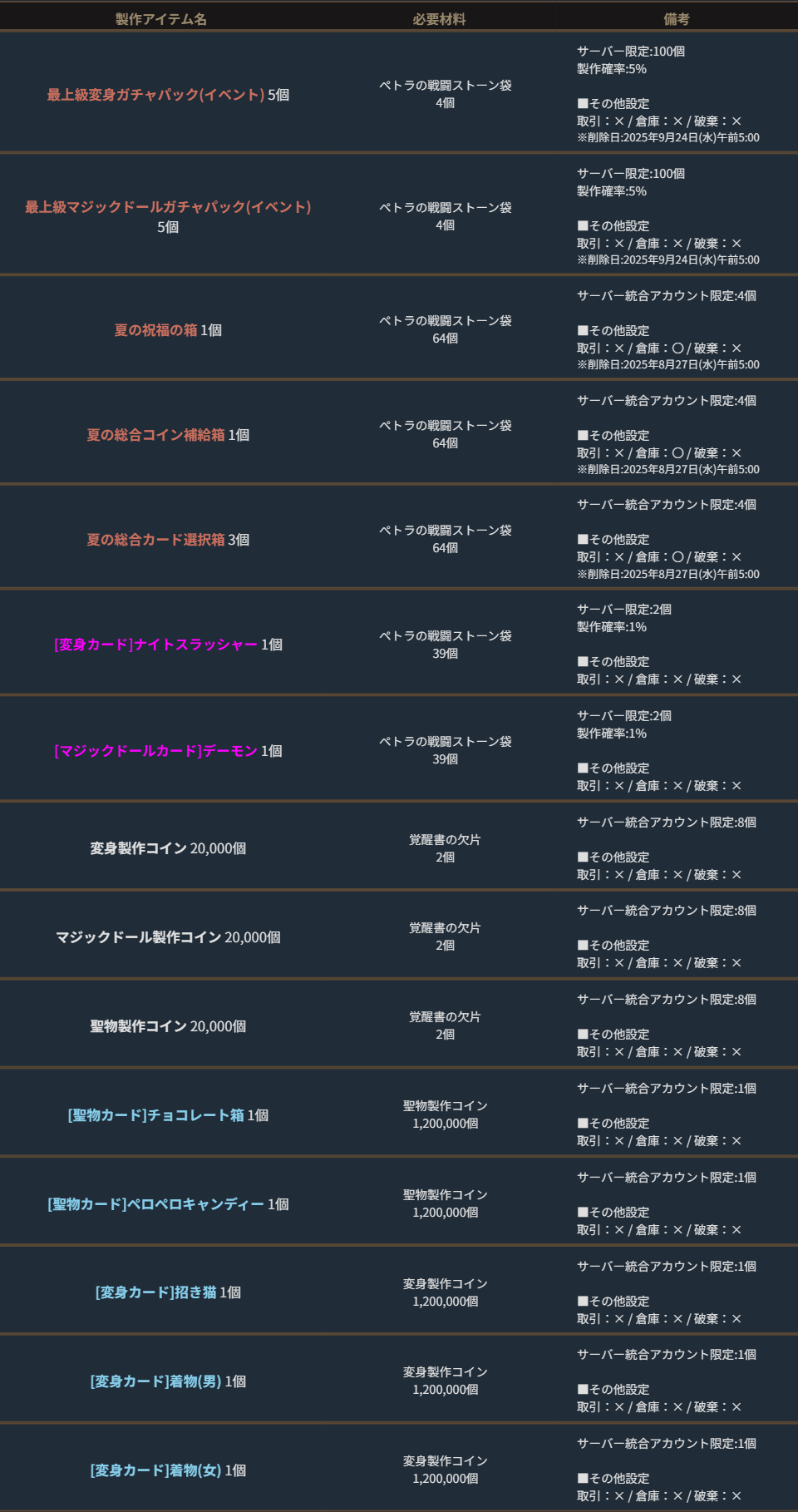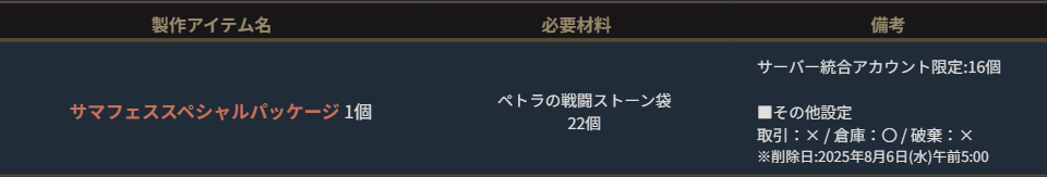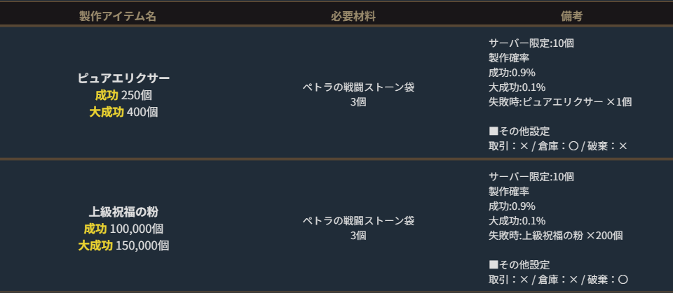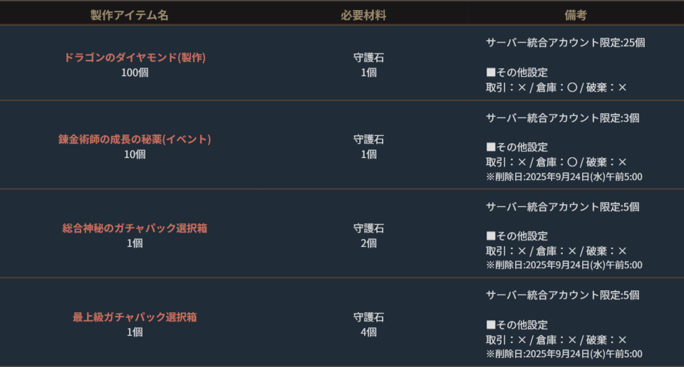 ※サーバー数量限定の製作アイテムは、各サーバーで製作できる数量に上限があります。