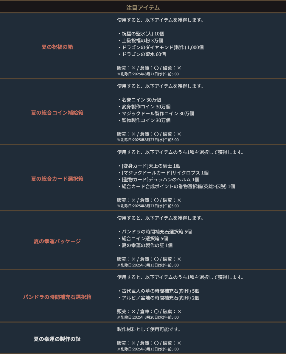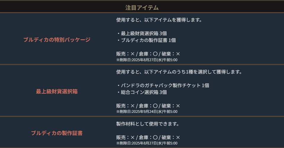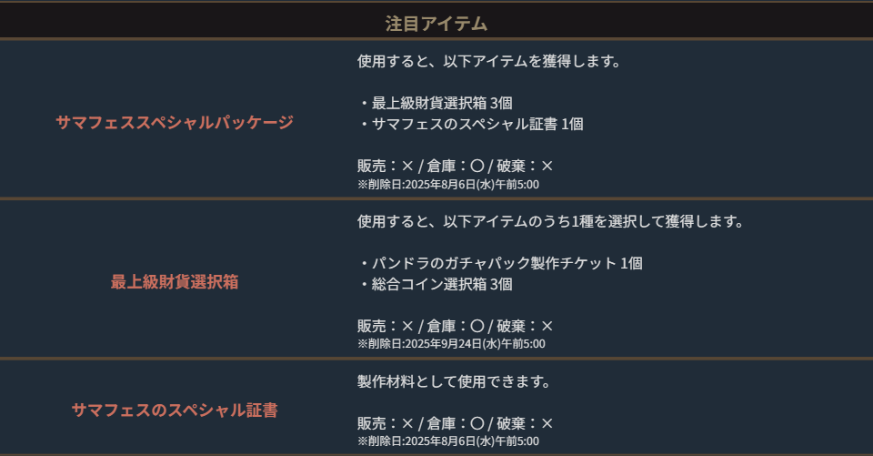 ※一部アイテムは未使用の場合、一定期間が経過すると自動で削除されます。詳しくは各アイテムの詳細をご確認ください。
