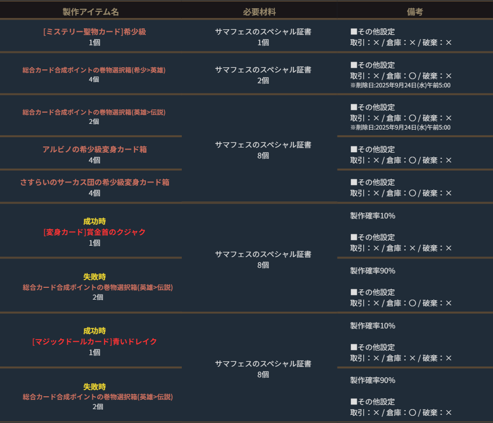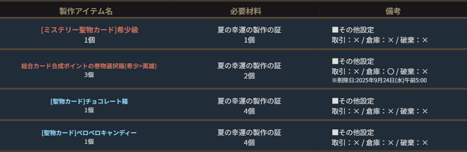 ※期間限定の製作アイテムは、製作可能期間のみゲーム内の「製作」より製作することができます。