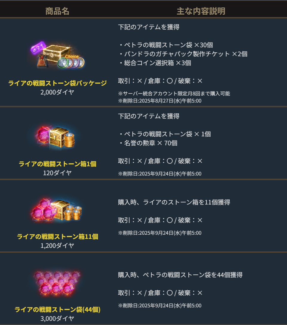 2025年8月6日より、ゲーム内ショップで販売を開始しました「ライアの戦闘ストーン箱」についてご案内します。