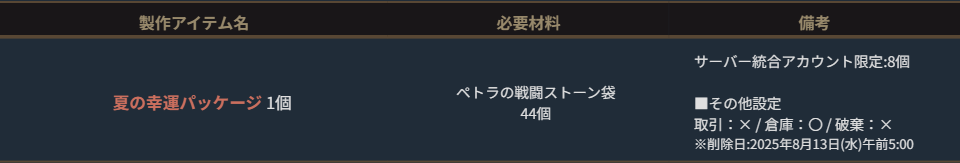 特別な製作の材料として使用可能で、そのまま使用した場合でも様々なバフ効果が得られるアイテムを獲得可能な「ペトラの戦闘ストーン袋」を含むパッケージが登場しました。