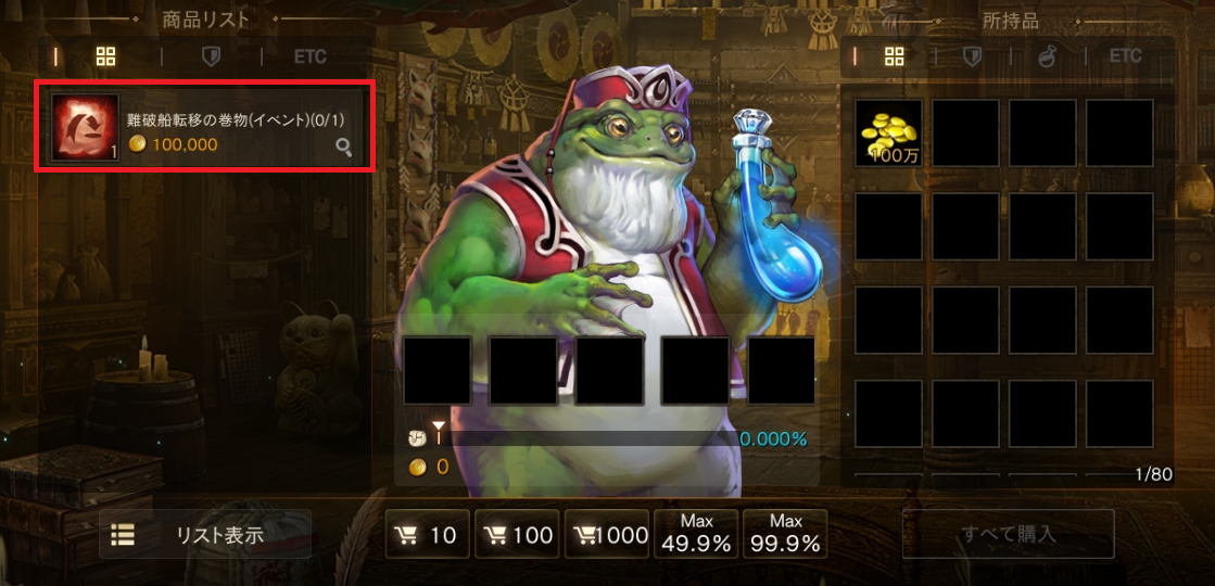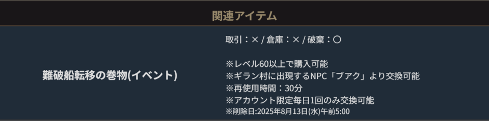 レベル60以上のキャラクターのみ100,000アデナで「難破船転移の巻物(イベント)」が毎日1回交換でき、使用するとイベントダンジョン「難破船」にテレポートできます。