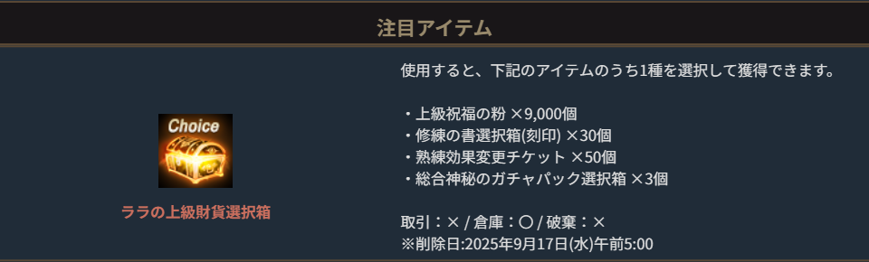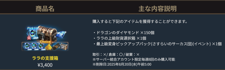 「最上級変身ピックアップパック(さすらいのサーカス団)(イベント)」、「ドラゴンのダイヤモンド」と一緒に、様々なアイテムのうち1種選択して獲得できる「ララの上級財貨選択箱」が入ったパッケージです。