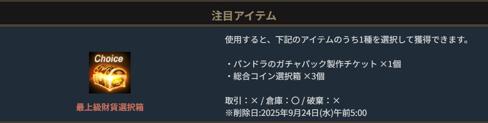 ※一部アイテムは未使用の場合、一定期間が経過すると自動で削除されます。詳細はゲーム内TIPをご確認ください。