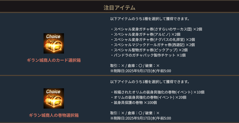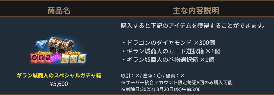 2025年7月30日より販売を開始しました「ギラン城商人のスペシャルガチャ箱」のご案内を申し上げます。